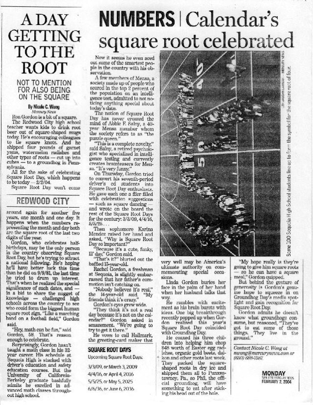 On 2/2/4 we cut vegetable roots into squares and Fed Ex'd them to Punxsutawney, where Groundhog Phil nibbled a bit. It will be next century before another rendezvous with Phil. In 2016, March Math Madness had a glorious final date: The Sweet 4 Squared winnowed to the Final Two Squared, which culminated in the NCAA Championship. The Final game shared the spotlight on Square Root Day, 4/4/16, with the opening of the Major League season---see, college math isn't that hard!