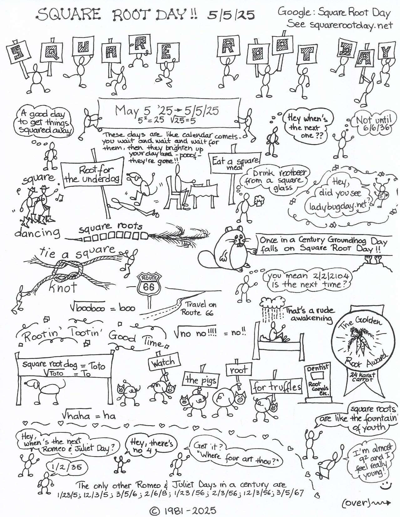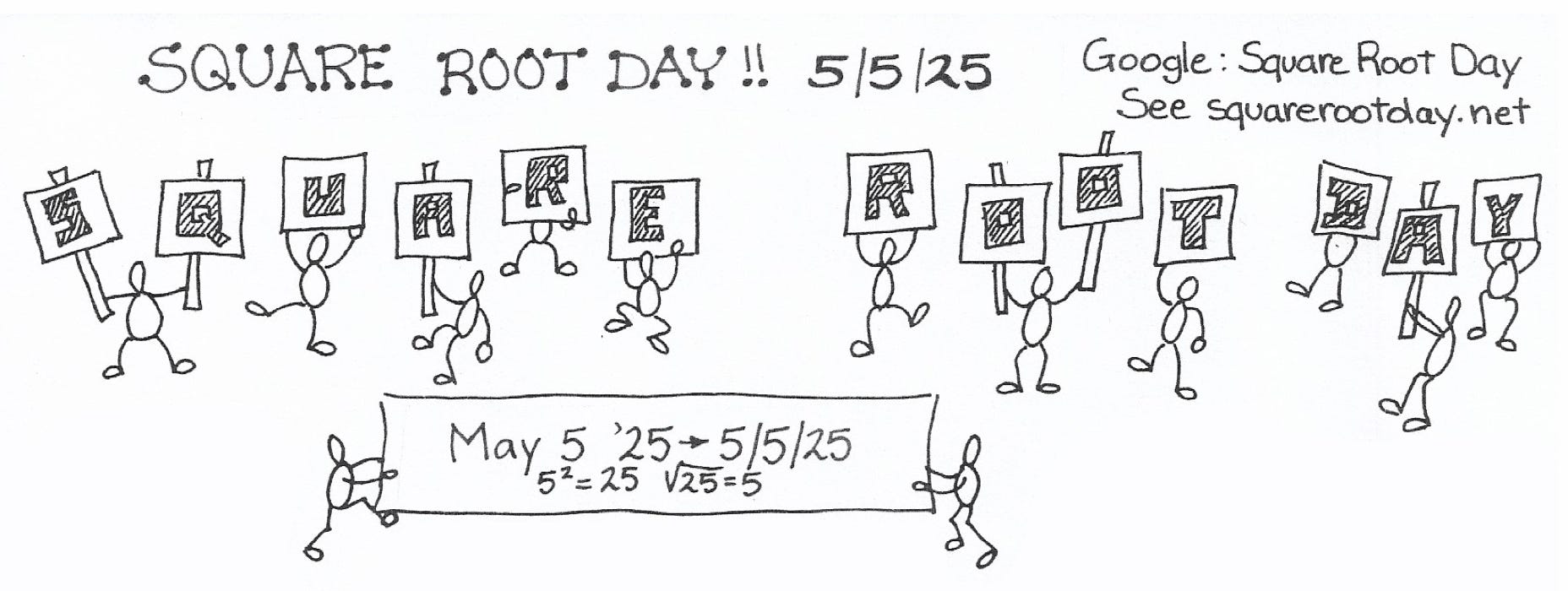 Square Root Day is Monday, 5/5/25. This is the only such day in the 20-year span from 4/4/16 to 6/6/36!!