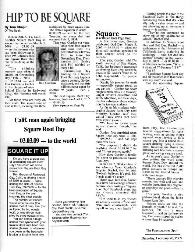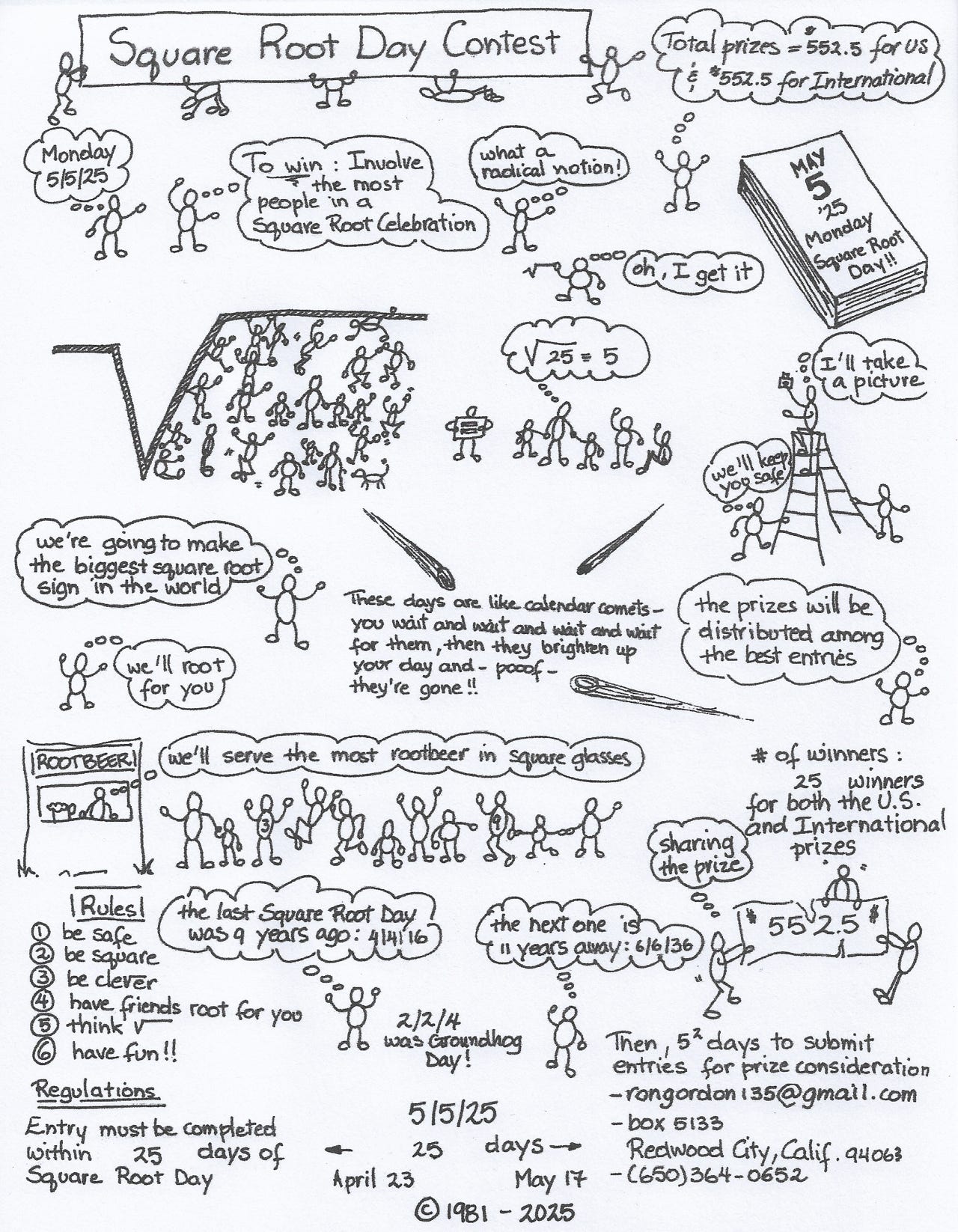 We've established a contest with two prize packets. Each group of winners will share the date in dollars---$552.5. One packet will be divided among 25 U.S. winners. A second grouping will share the international prize, also totaling $552.5. The winners will be those who involve the most people in a Square Root celebration. Entries can include creating the largest square root sign from people, serving rootbeer in square glasses to the most folks, or cutting many roots into squares (well, cubes) for a square root stew.